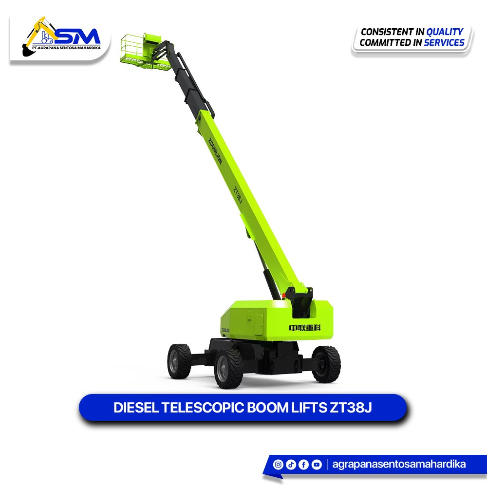 The ZOOMLION TELESCOPIC BOOM LIFT ZT38J-V/ZT42J-V are CE-compliant, lightweight telescopic boom lifts offering working heights up to 44m and a 25m horizontal outreach, with a dual platform capacity of 300/454kg. They feature a rigid hexagonal boom, X-type chassis for stability, compact size for shipping, and energy-saving technology, providing efficient and